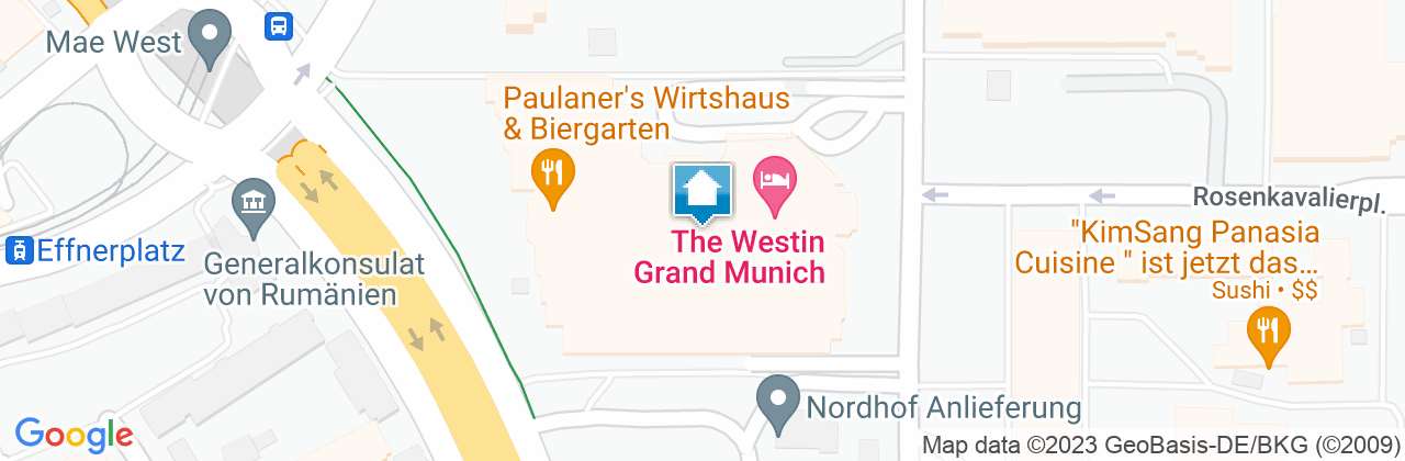 Das The Westin Grand München liegt verkehrsgünstig im Arabellapark mit bester Anbindung zu Stadt, Messe und Flughafen. Die in nur fünf Gehminuten erreichbaren öffentlichen Verkehrsmittel bringen Sie binnen 10 Minuten in die Münchner Altstadt und zum Hauptbahnhof. Im Arabellapark selbst gibt es zahlreiche Geschäfte, Boutiquen und Restaurants sowie ein Kino. Münchens berühmter Park, der Englische Garten mit seinen Biergärten und den langen Spazierwegen, kann in wenigen Minuten zu Fuß erreicht werden; sportliche Gäste können ihn auch mit dem RunCongierce des Hotels beim morgendlichen Jogging erkunden.