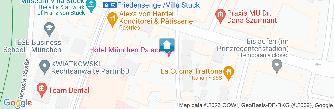 Das Hotel München Palace liegt im noblen Viertel Bogenhausen, in direkter Nachbarschaft zum Prinzregententheater, zu der Villa Stuck, dem Friedensengel und dem Maximilianeum. Auch der Englische Garten ist nur ein Steinwurf vom Hotel entfernt.
